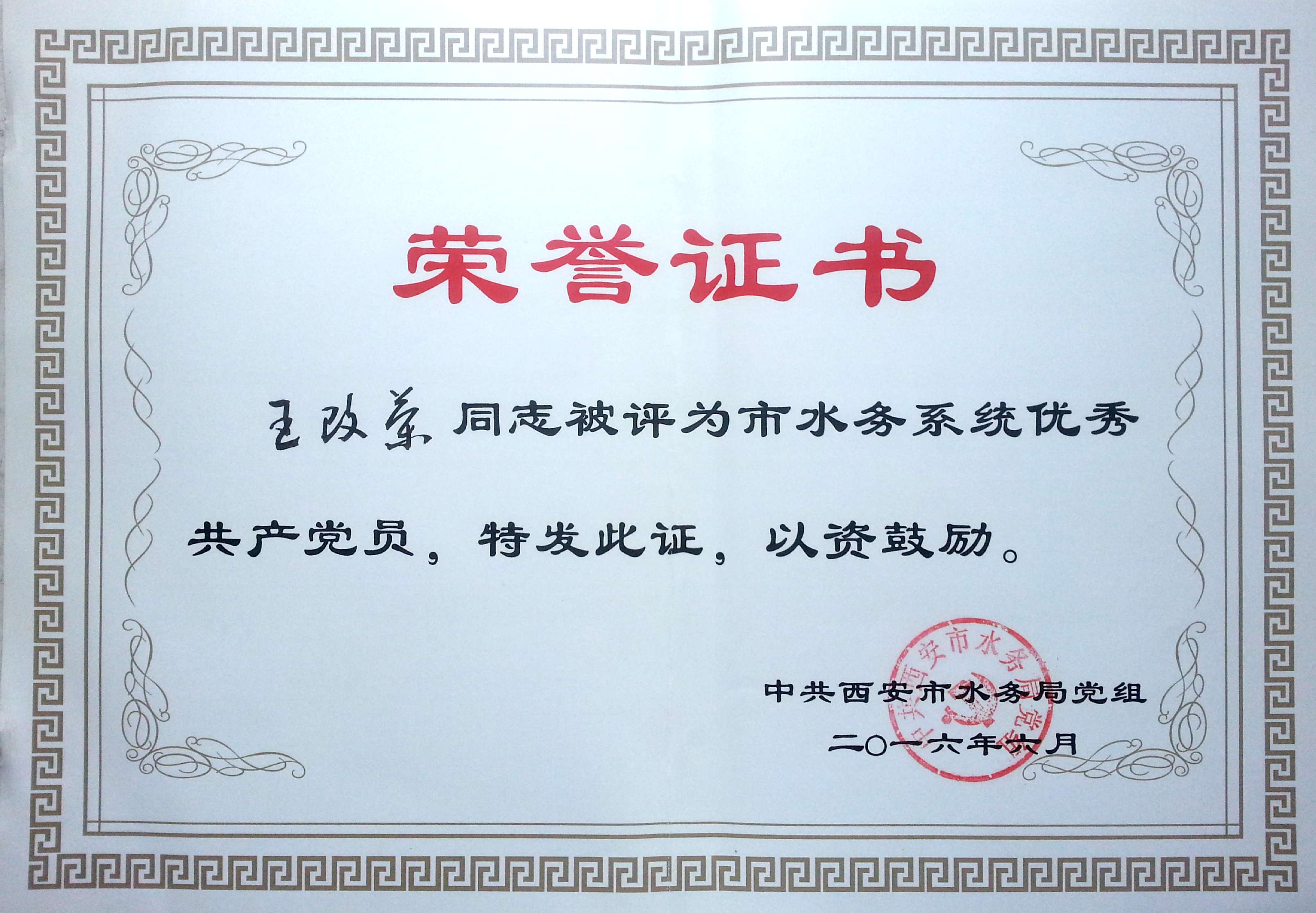 我單位王改榮同志,在2016年6月6日被中共西安市水務(wù)局黨組評(píng)為市水務(wù)系統(tǒng)優(yōu)秀共產(chǎn)黨員。